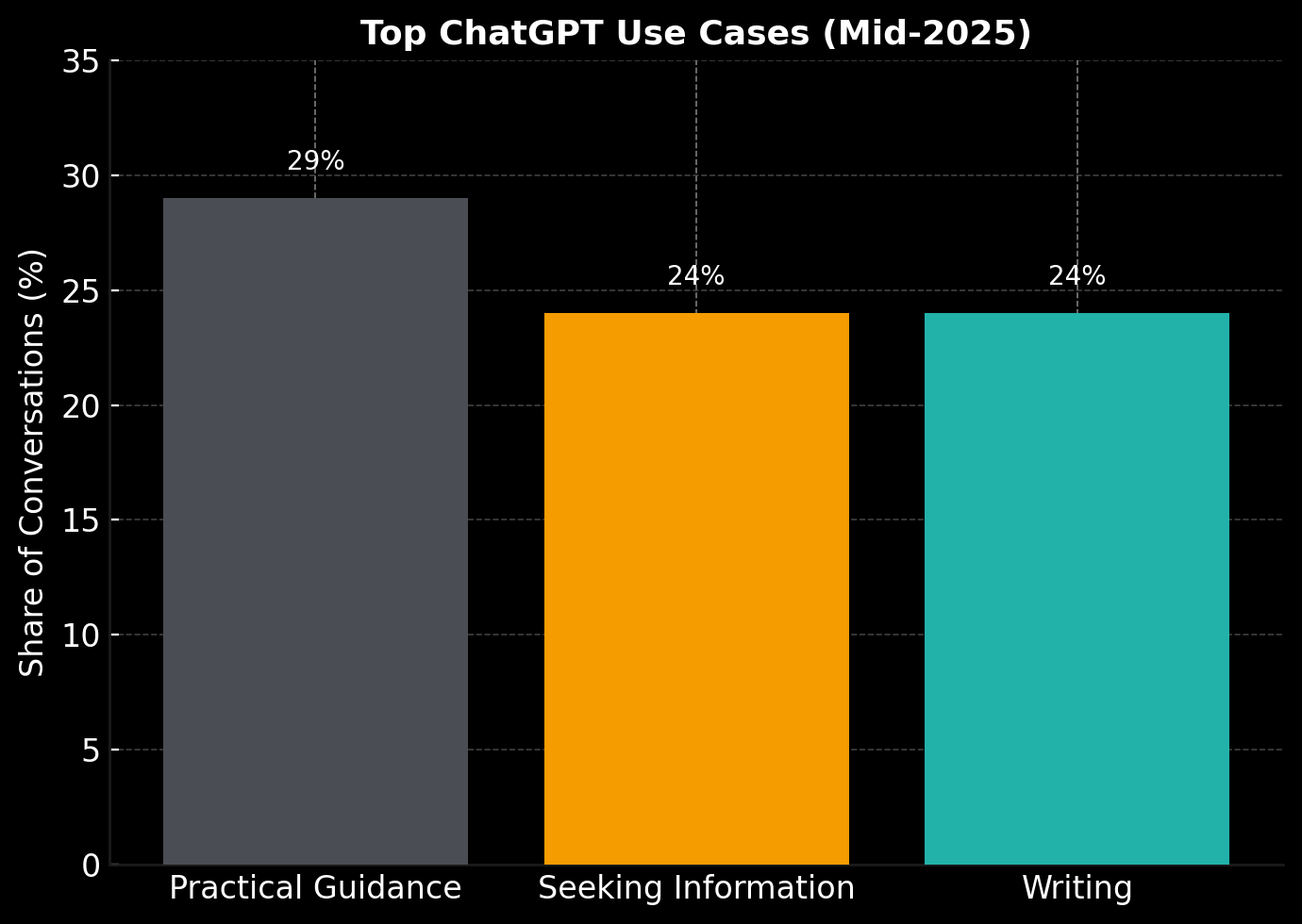 - Practical Guidance (29%): This is the most common use case and includes things like tutoring, "how-to" advice, and creative brainstorming. Notably, education is a key application, with tutoring and teaching requests making up over 10% of all messages.